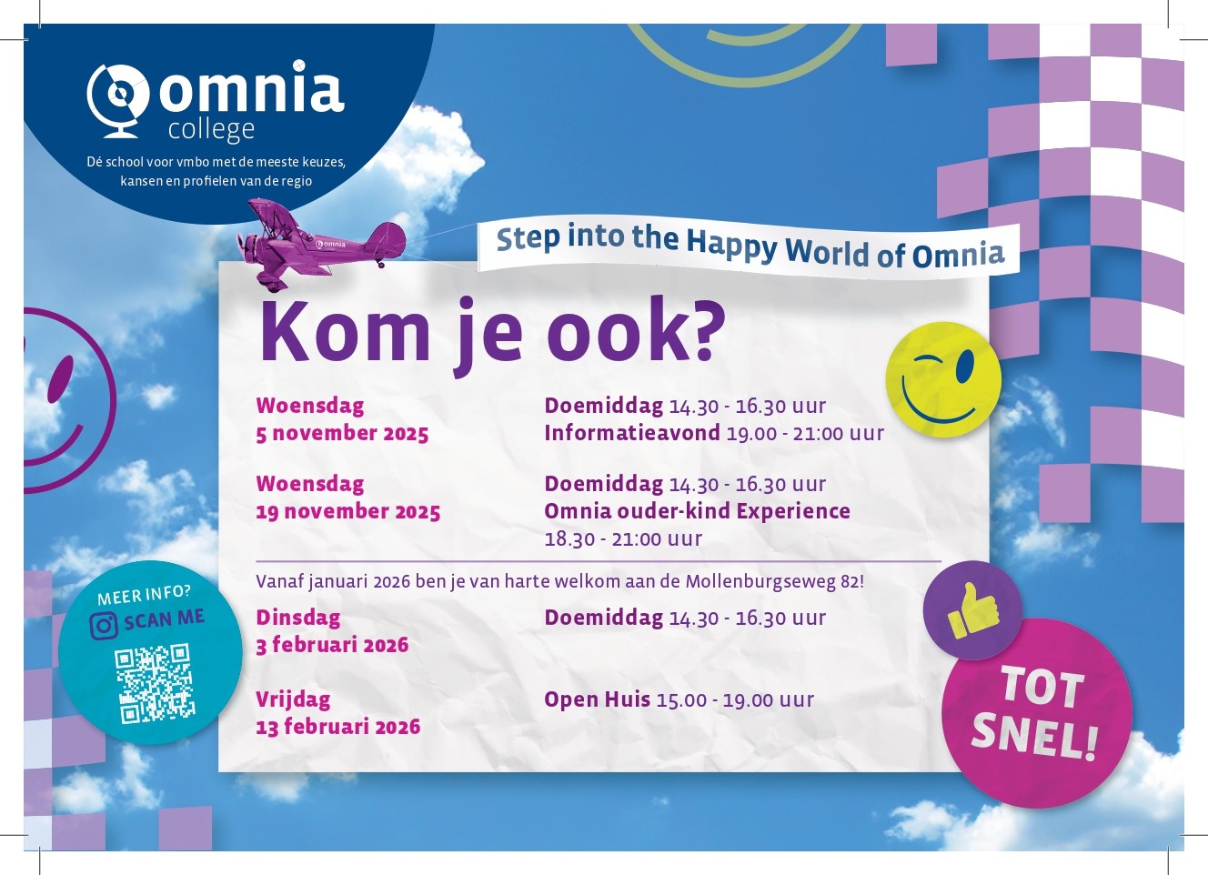 - Inschrijven voor onze Omnia Experience kan hier. Dit belooft een heel bijzondere activiteit te worden. Klik vooral op de link welke workshops jij met je ouders kunt volgen. 18.30-21.00 uur